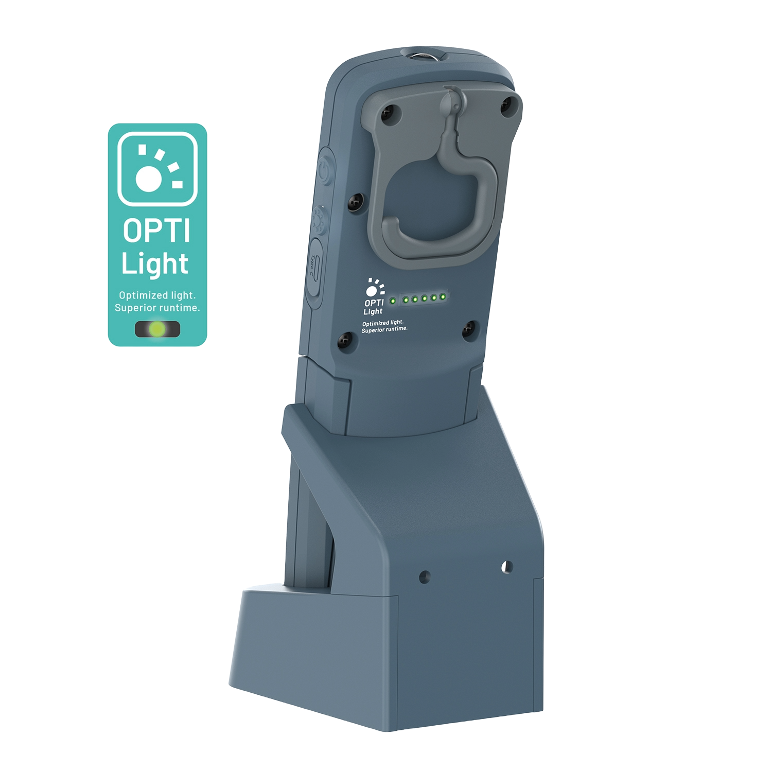 Die OPTILight-Einstellung liefert die erforderliche Beleuchtungsstärke (LUX) in einer typischen Arbeitssituation und sorgt mit einem einfachen Druck für optimales Licht und optimale Laufzeit. Diese Arbeitsleuchte bietet eine konstante Lumenleistung, gemessen nach der europäischen Norm EN 13032-1.